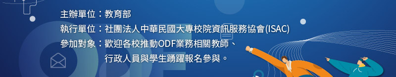 ODF(Open Document Format)是一種跨平台、不受軟體限制的開放文件格式,能避免常見的跑版問題,並確保文件能長期保存與自由交換。此外,教育部與本協會也於每年度舉辦全國ODF競賽,提供豐富獎金與教育部獎狀,鼓勵師生以創意與實作展現ODF在教學、行政與學習上的應用。